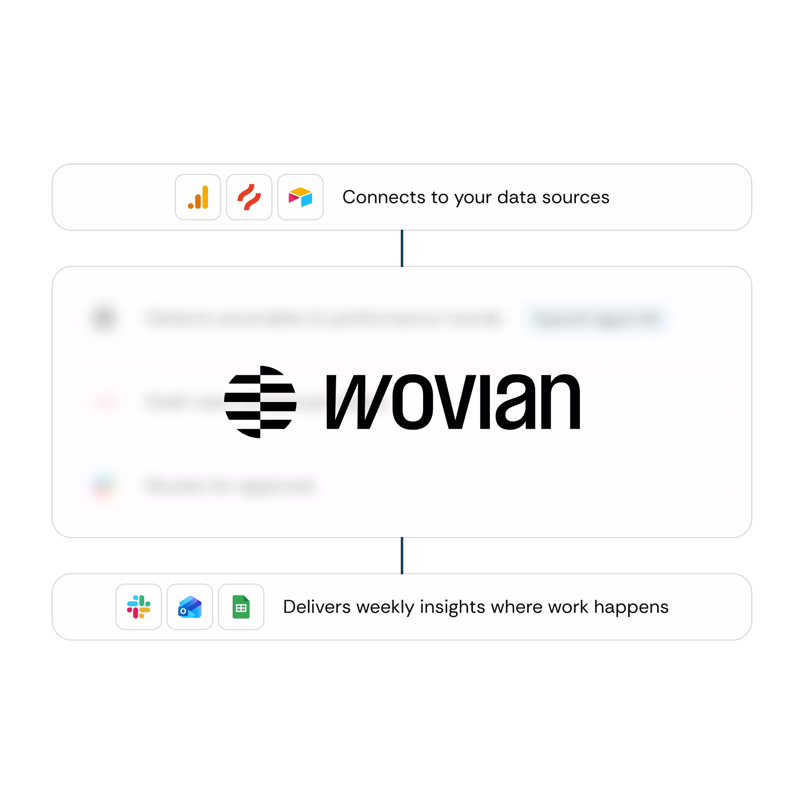 Pulls data from every channel, detects anomalies and trends, translates them into plain-language insights, and delivers the right reports to the right people, without dashboards or manual digging.